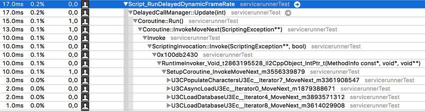 This can be observed in the above screenshot, where the DelayedCallManager is resuming several different coroutines: PopulateCharacters, AsyncLoad and LoadDatabase are the notable ones.
