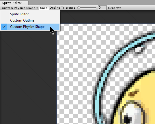 In the Sprite Editor window, select the top left drop-down menu and choose Custom Physics Shape.