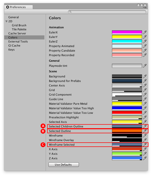 When Selection Outline is enabled, an outline appears around selected GameObjects and their child GameObjects. By default, Unity outlines selected GameObjects in orange, and child GameObjects in blue. You can change these colors in the Unity preferences (see Selection Colors, below).