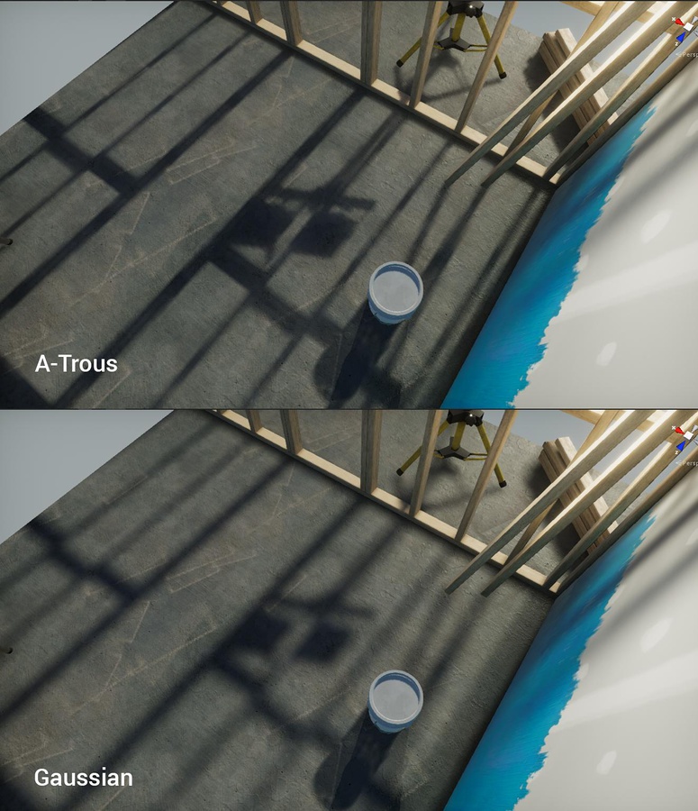 Filtering allows you to blur noisy results. The Progressive Lightmapper offers two different types of filtering: Gaussian and A-Trous. When you enable Advanced settings, you can apply these filters for Direct, Indirect and Ambient OcclusionA method to approximate how much ambient lighting (lighting not coming from a specific direction) can hit a point on a surface.