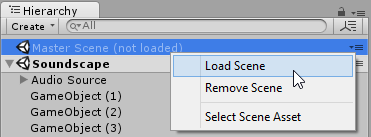 | Unload Scene | Unloads the scene, but keeps the scene in the Hierarchy window. |