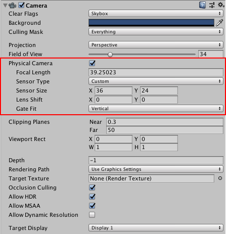 Unity provides the same settings as those in most 3D modeling application’s physical camera settings. The two main properties that control what the camera sees are Focal Length and Sensor Size.