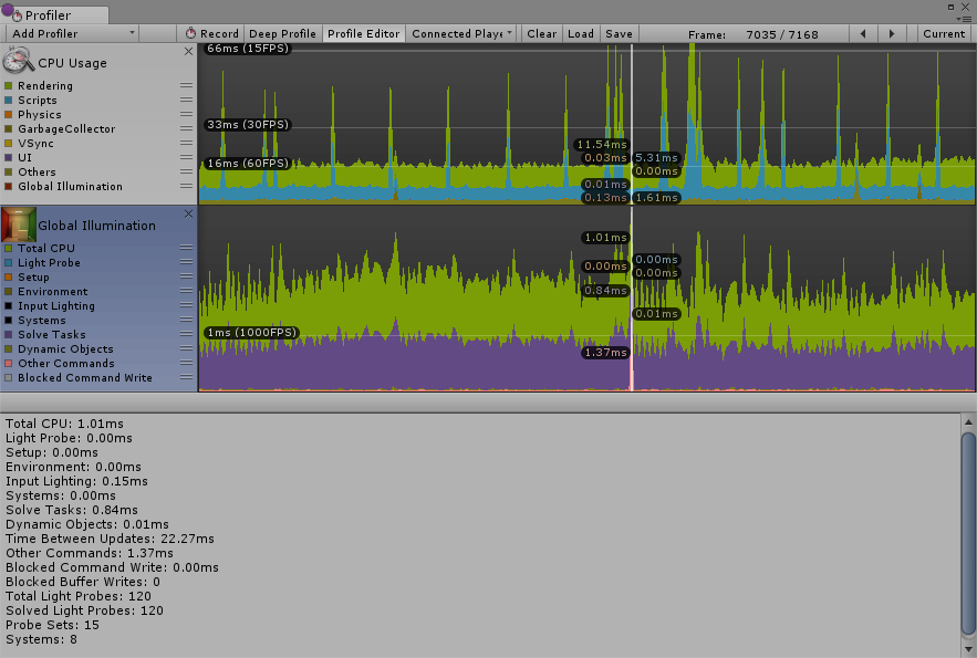 The Global Illumination ProfilerA window that helps you to optimize your game. It shows how much time is spent in the various areas of your game. For example, it can report the percentage of time spent rendering, animating or in your game logic. More info