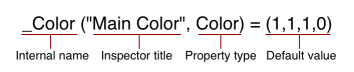 The properties are listed on separate lines within the Properties block. Each property starts with the internal name (Color, MainTex). After this in parentheses comes the name shown in the inspector and the type of the property. After that, the default value for this property is listed: