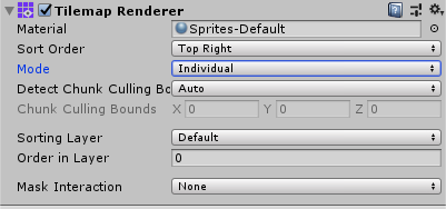 In Individual Mode, the Tilemap Renderer sorts and renders the Sprites on a Tilemap with consideration of other Renderers in the Scene, such as the Sprite RenderersA component that lets you display images as Sprites for use in both 2D and 3D scenes. More info