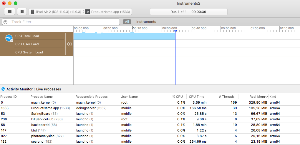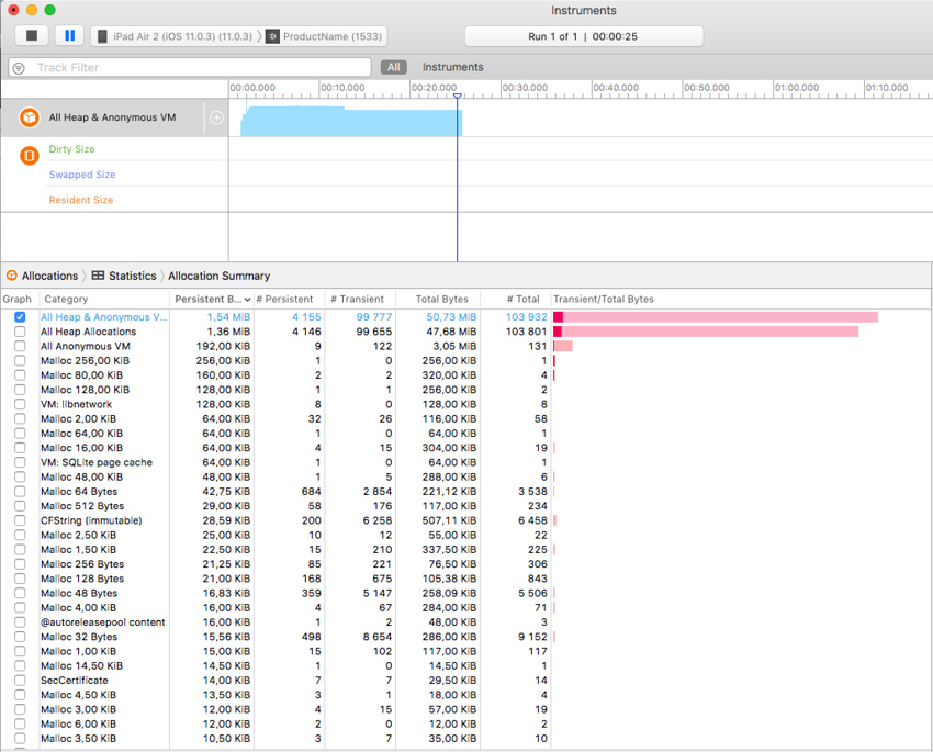 See in Glossary. Total memory usage can be determined via Xcode Instruments as shown above. This figure includes parts of the application binary, some standard framework buffers, Unity engine internal state buffers, the .NET runtime heap (number printed by internal profiler), GLES driver heap and some other miscellaneous stuff.