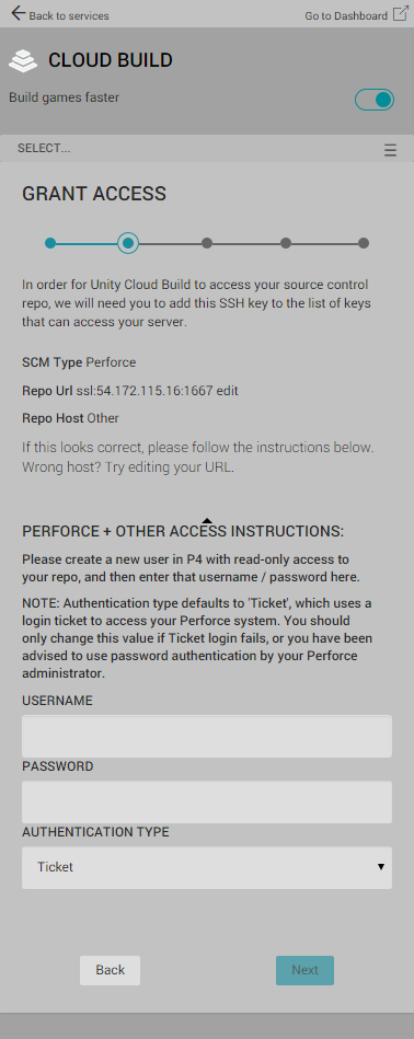 Using the Unity Developer Dashboard to configure Unity Cloud Build for Perforce