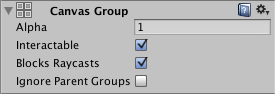 elements from one place without needing to handle them each individually. The properties of the Canvas Group affect the GameObjectThe fundamental object in Unity scenes, which can represent characters, props, scenery, cameras, waypoints, and more. A GameObject’s functionality is defined by the Components attached to it. More info