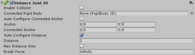 Distance Specify the distance that the Distance Joint 2D keeps between the two GameObjects.