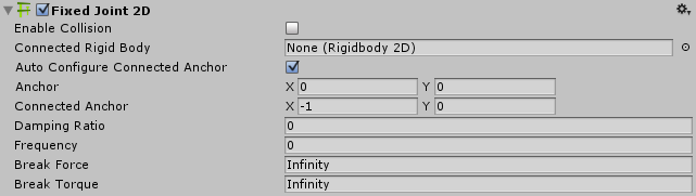 Connected Rigid Body Specify the other GameObject this Fixed Joint 2D connects to. Leave this as None to fix the other end of the Fixed Joint 2D to a point in space defined by the Connected Anchor setting. Select the circle to the right of the field to view a list of GameObjects to connect to.