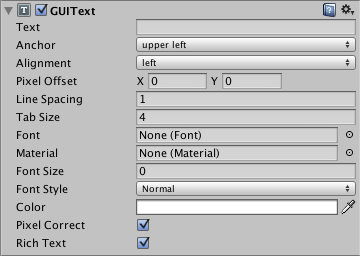 Pixel Offset Offset of the text relative to the position of the GUIText in the screen.