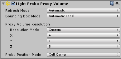 The number of interpolated Light Probes from within the bounding volume is affected by the Proxy Volume Resolution property. There are two options: