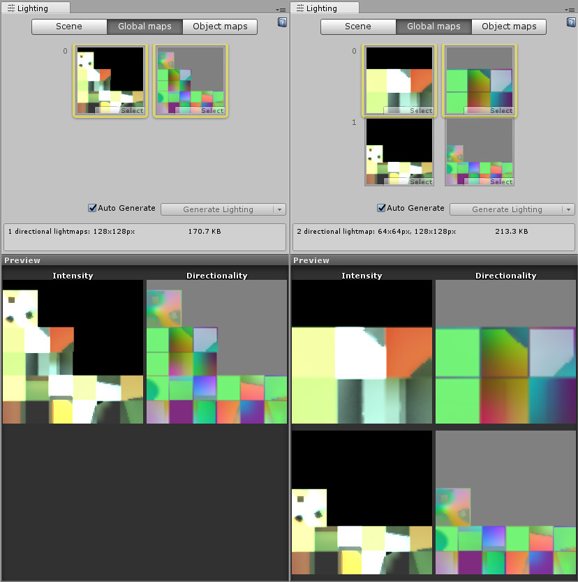 | Direct Light Quality | The number of rays used to evaluate direct lighting. A higher number of rays tends to produce more accurate soft shadows but increases bake time. | Direct Light Quality is not available when you use Progressive Lightmapper. |