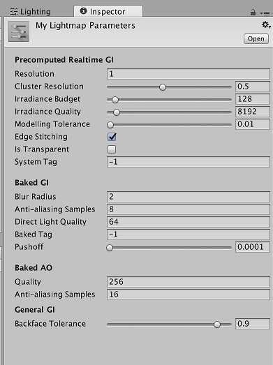 Lightmap Parameters Assets allow you to quickly create presets optimized for different types of GameObjectsThe fundamental object in Unity scenes, which can represent characters, props, scenery, cameras, waypoints, and more. A GameObject’s functionality is defined by the Components attached to it. More info