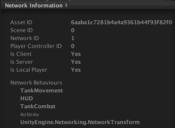This component contains network tracking information, and displays that information in the preview pane. For example, the scene ID, network ID and assetAny media or data that can be used in your game or Project. An asset may come from a file created outside of Unity, such as a 3D model, an audio file or an image. You can also create some asset types in Unity, such as an Animator Controller, an Audio Mixer or a Render Texture. More info