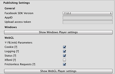 Show WebGL Player Settings Click this button to switch to the WebGL Player settings, which affect any Facebook builds for WebGL.