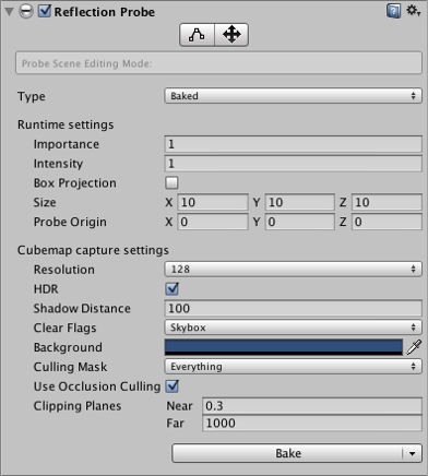 There are two buttons at the top of the Reflection Probe InspectorA Unity window that displays information about the currently selected GameObject, Asset or Project Settings, allowing you to inspect and edit the values. More info