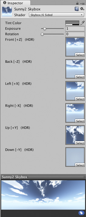 | Front, etc | The textures used for each face of the cube used to store the skybox. Note that it is important to get these textures into the correct slot. |
