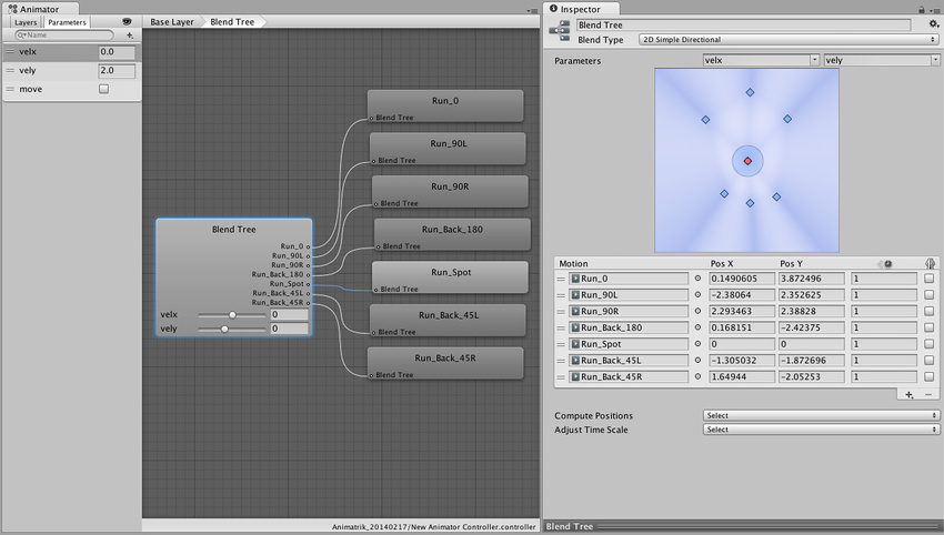 For blending control we add two float parameters velx and vely, and assign them to the blend tree.