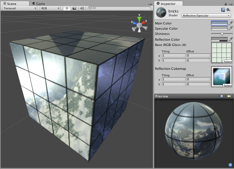 See in Glossary which will define what exactly is reflected. The main texture’s alpha channel defines the strength of reflection on the object’s surface. Any sceneA Scene contains the environments and menus of your game. Think of each unique Scene file as a unique level. In each Scene, you place your environments, obstacles, and decorations, essentially designing and building your game in pieces. More info
