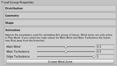 Adjusts the parameters used for animating this group of leaves. Wind zonesA GameObject that adds the effect of wind to your terrain. For instance, Trees within a wind zone will bend in a realistic animated fashion and the wind itself will move in pulses to create natural patterns of movement among the tree. More info