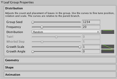 Adjusts the count and placement of leaves in the group. Use the curves to fine tune position, rotation and scale. The curves are relative to the parent branch.