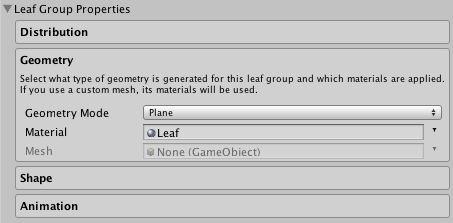 Select what type of geometry is generated for this leaf group and which materials are applied. If you use a custom mesh, its materials will be used.
