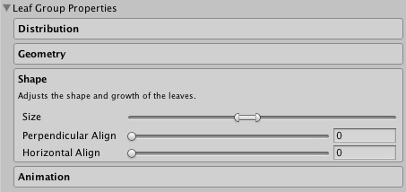 Size Adjusts the size of the leaves, use the range to adjust the minimum and the maximum size.