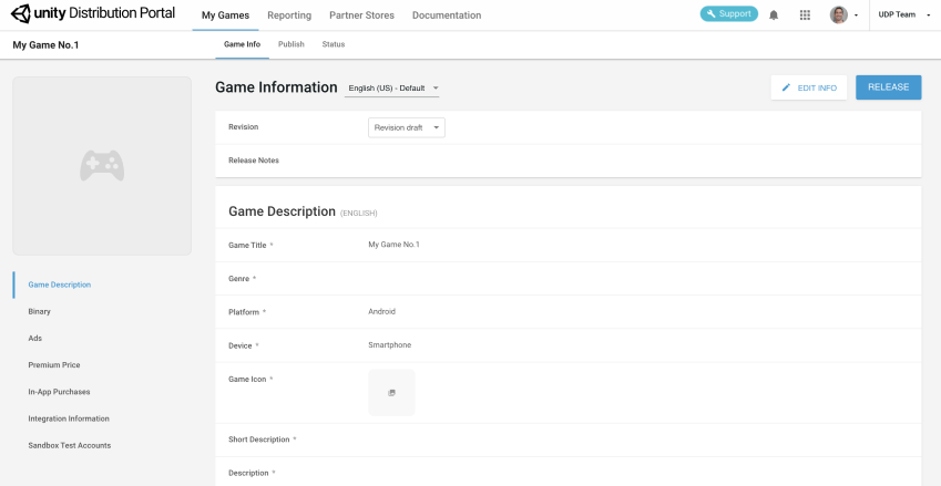 | Minimum Android Version Support | Minimum supported Android version for your game. This field is only displayed once you’ve uploaded your game to UDP. |
