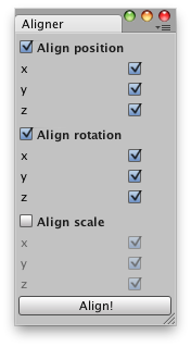 public class Aligner : EditorWindow { bool[] pos = new bool[3] { true, true, true }; bool[] rot = new bool[3] { true, true, true }; bool[] scale = new bool[3] { true, true, true };