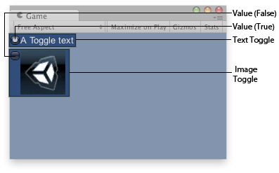 void OnGUI() { if (!aTexture) { Debug.LogError("Please assign a texture in the inspector."); return; } toggleTxt = GUILayout.Toggle(toggleTxt, "A Toggle text"); toggleImg = GUILayout.Toggle(toggleImg, aTexture); } }