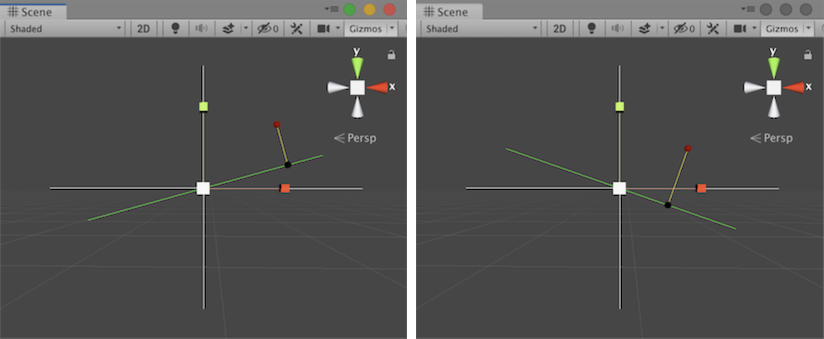 // Show a Scene view example. void OnDrawGizmosSelected() { // Left/right and up/down axes. Gizmos.color = Color.white; Gizmos.DrawLine(transform.position - new Vector3(2.25f, 0, 0), transform.position + new Vector3(2.25f, 0, 0)); Gizmos.DrawLine(transform.position - new Vector3(0, 1.75f, 0), transform.position + new Vector3(0, 1.75f, 0));