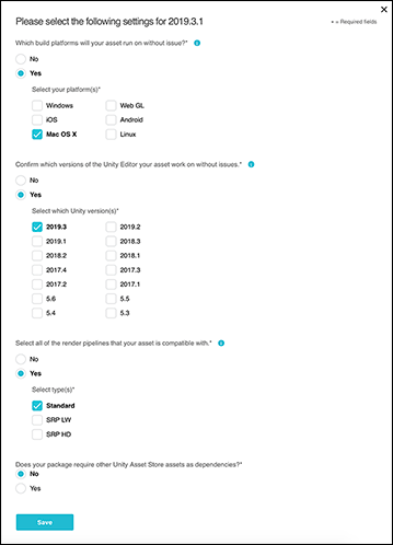 For each section, select Yes to display a question and a set of checkboxes. Then check or uncheck the options that answer the questions about your package. When you are finished, click Save to return to the Package upload section.