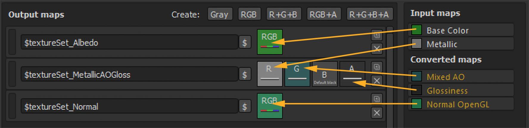 Note: Packing multiple channels to a single texture, such as the MetallicAOGloss, saves texture memory compared to exporting Ambient OcclusionA method to approximate how much ambient light (light not coming from a specific direction) can hit a point on a surface.