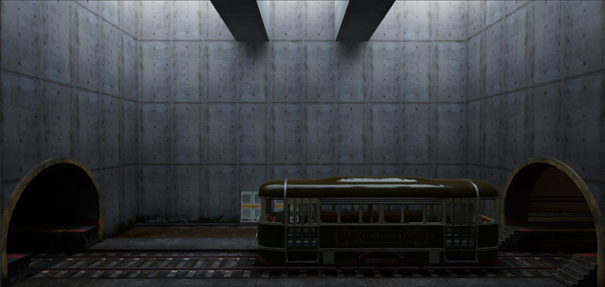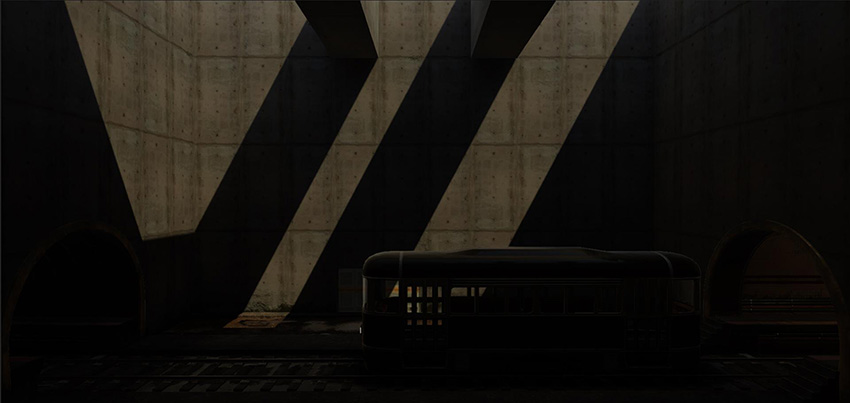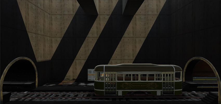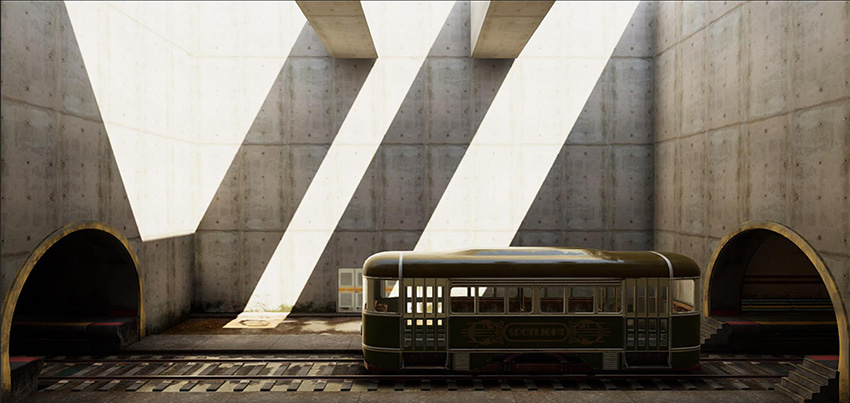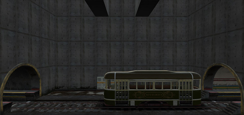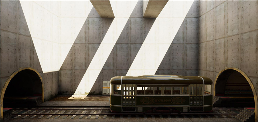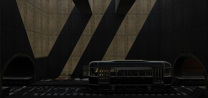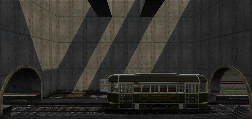 At this stage, the example Scene is now dark, and some elements of the Scene look out of place, such as the tram and the door on the background: