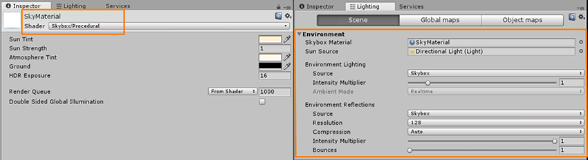 A procedural SkyboxA special type of Material used to represent skies. Usually six-sided. More info