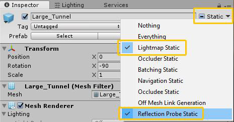 See in Glossary in your Scene and, in the Inspector window in the Static drop-down menu, enable Contribute GI and Reflection ProbesA rendering component that captures a spherical view of its surroundings in all directions, rather like a camera. The captured image is then stored as a Cubemap that can be used by objects with reflective materials. More info