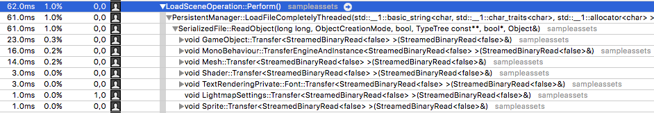 In the above screenshot, a Scene is being loaded. This requires Unity to read and deserialize all the Assets within the Scene, as denoted by the calls to various Transfer methods beneath SerializedFile::ReadObject.