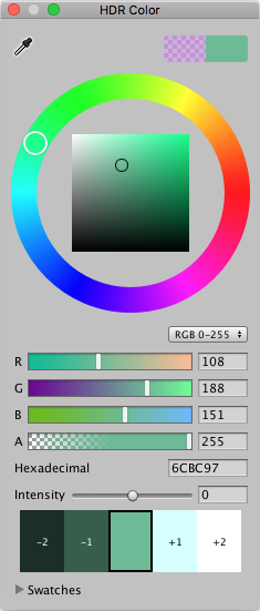Whenever you close the HDR Color window and reopen it, the window derives the color channel and intensity values from the color you are editing. Because of this, you might see slightly different values for the color channels in HSV and RGB 0–255 mode or for the Intensity slider, even though the color channel values in RGB 0–1.0 mode are the same as the last time you edited the color.