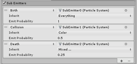 Sub Emitters Configure a list of sub-emitters and select their trigger condition as well as what properties they inherit from their parent particles.