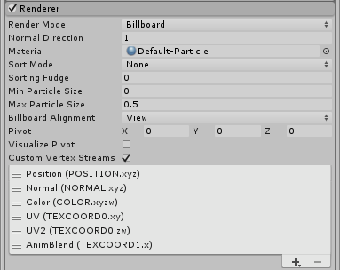 See in Glossary, use this addition to the Renderer Module to configure your Particle SystemsA component that simulates fluid entities such as liquids, clouds and flames by generating and animating large numbers of small 2D images in the scene. More info