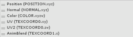 See in Glossary, Color, UV), but also uses two additional streams for the second UV stream (UV2) and the flip-book frame information (AnimBlend).