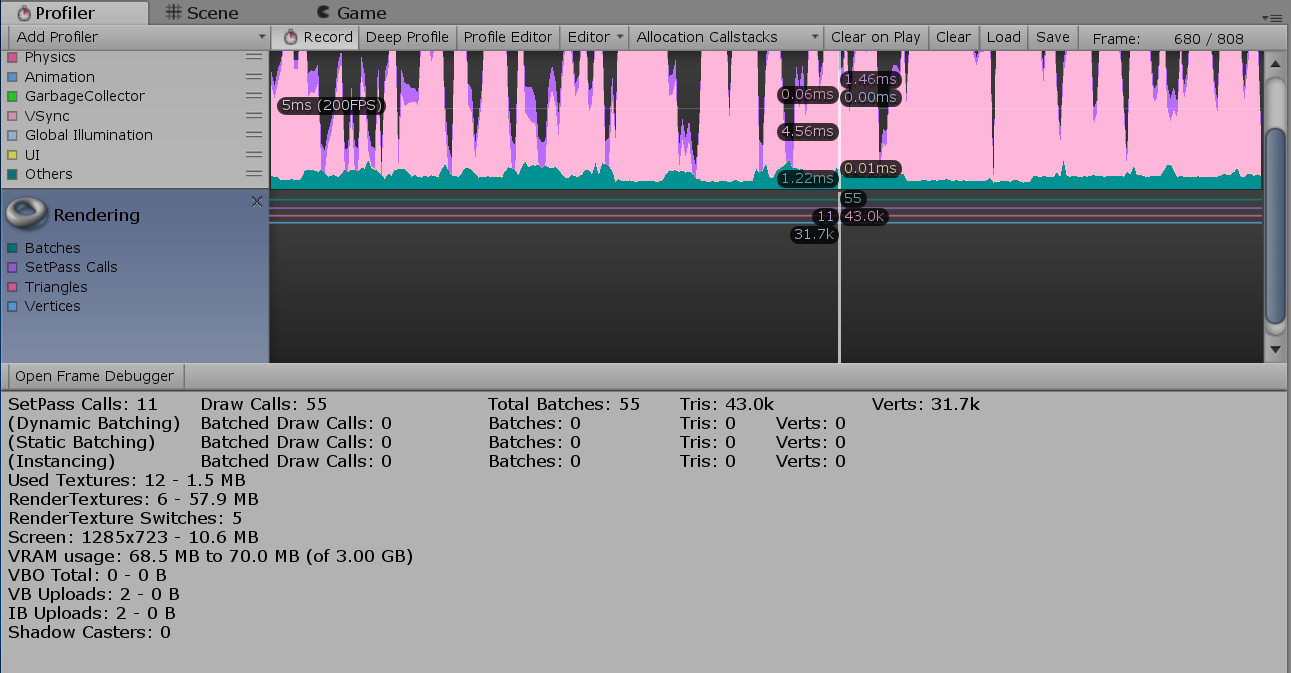 See in Glossary displays rendering statistics. The timeline displays the number of Batches, SetPass Calls, Triangles and Vertices rendered. The lower pane displays more rendering statistics, which closely match the ones shown in the GameView Rendering Statistics window.