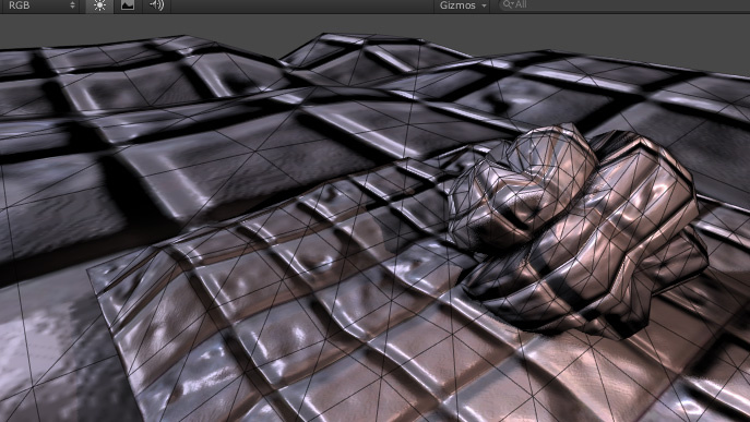 disp samples the displacement map and moves vertices along their normals.appdata) instead of default appdata_full. This is not needed yet, but it’s more efficient for tessellation to use as small structure as possible.nolightmap directive to exclude lightmapsA pre-rendered texture that contains the effects of light sources on static objects in the scene. Lightmaps are overlaid on top of scene geometry to create the effect of lighting. More infoThe image below displays some simple GameObjectsThe fundamental object in Unity scenes, which can represent characters, props, scenery, cameras, waypoints, and more. A GameObject’s functionality is defined by the Components attached to it. More info