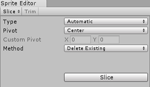 Isolating the Sprite rectangles manually works well but in many cases, Unity can save you work by detecting the graphic elements and extracting them for you automatically. If you click on the Slice menu in the control bar, you will see this panel: