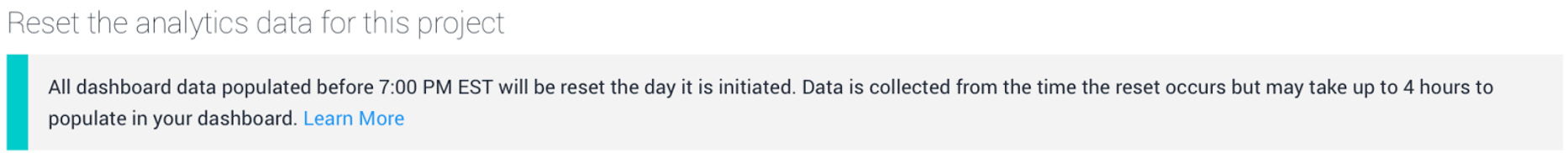 See in Glossary allows you to permanently clear all data from your Analytics dashboard by performing a data reset. This action cannot be undone, so read this documentation and the confirmation message in the Analytics dashboard carefully before carrying out this action.