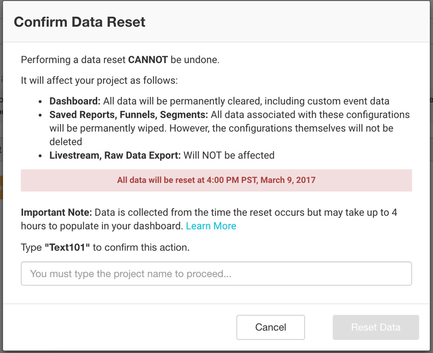 Reports, Funnels, Segments: All data associated with these configurations (that you have created in your project) is permanently wiped from the dashboard. However, the configurations themselves are not deleted. For example, if you create a three-step funnel, populate it with data, and then perform a data reset, the three-step funnel is still present in your dashboard but is no longer populated with the data.
