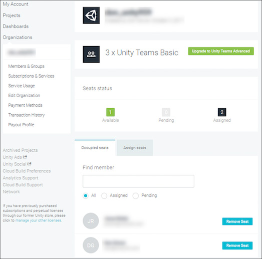 This opens a page which allows you to assign Unity Teams seats to members of your organization. Use the Occupied seats tab to review team members to whom you have assigned a Teams seat. Use the Assign seats tab to add team members with registered Unity IDs, using the email address they used to register for a Unity ID.