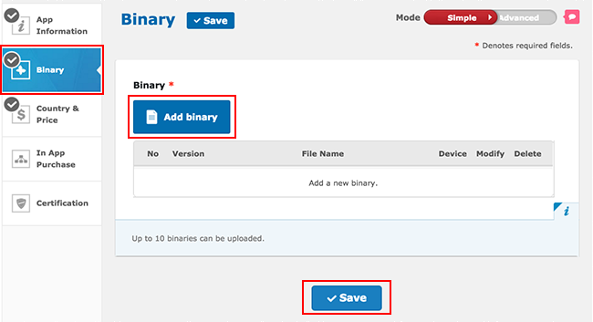 Populate the device characteristics in Resolution(s) and Google Mobile Service, upload your APK (the one you created above in the “Getting Started” section) in Binary upload, then click Save.