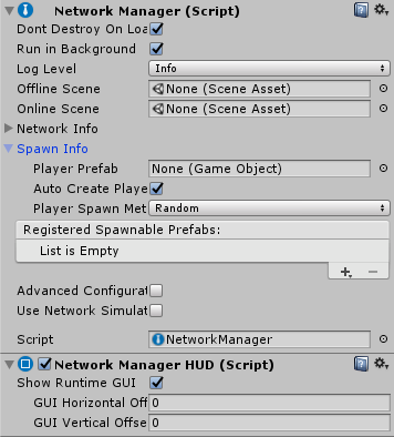 Add the components NetworkManager and NetworkManagerHUD to the empty GameObject. Rename this object to “Network Manager” so that you know what it is.